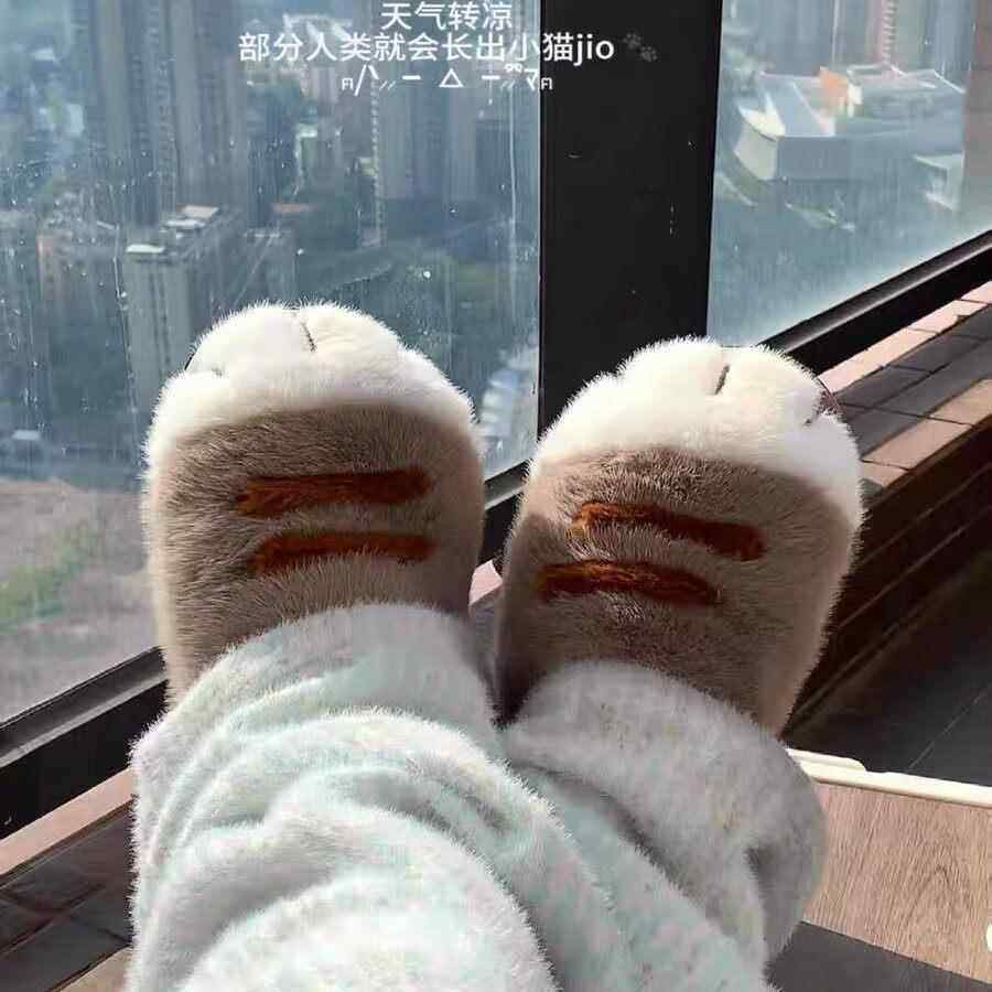 可爱猫爪印鞋可外穿棉拖鞋女款冬季加绒保暖小猫居家厚底包跟宿舍