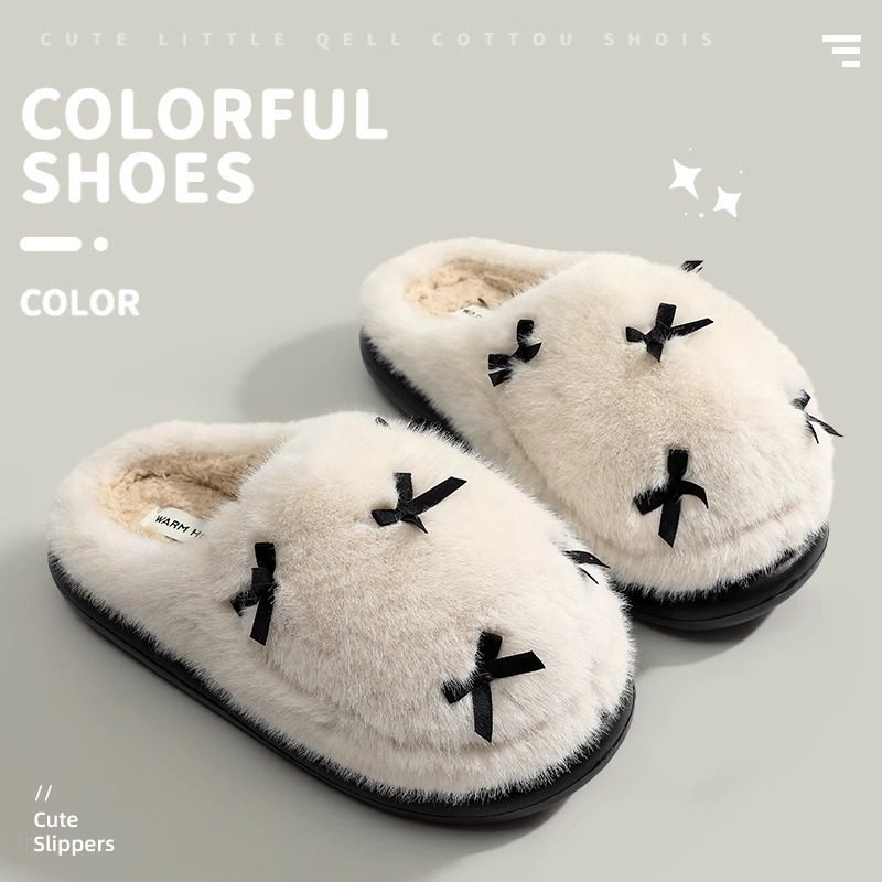 防水棉拖鞋女冬季室内外穿时尚蝴蝶结低跟防滑加绒保暖棉鞋