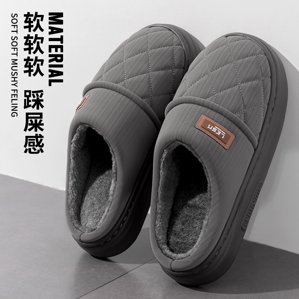 防水棉拖鞋男士秋冬季2024新款室内家居防滑皮面厚底毛拖鞋女冬天