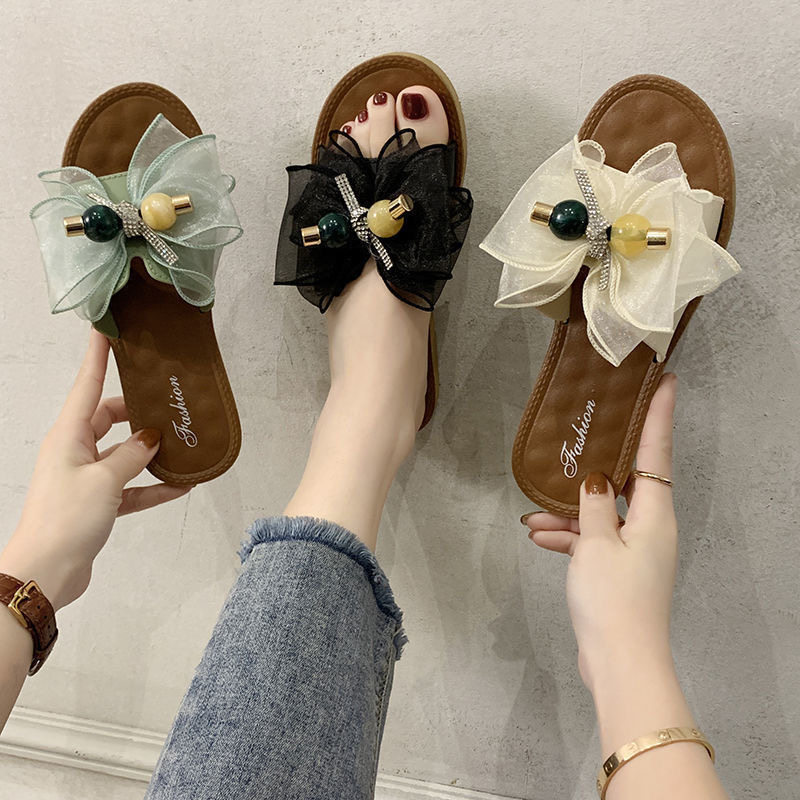 网红凉拖鞋女时尚潮流新款百搭低跟平底韩版夏蝴蝶结外穿一字拖鞋
