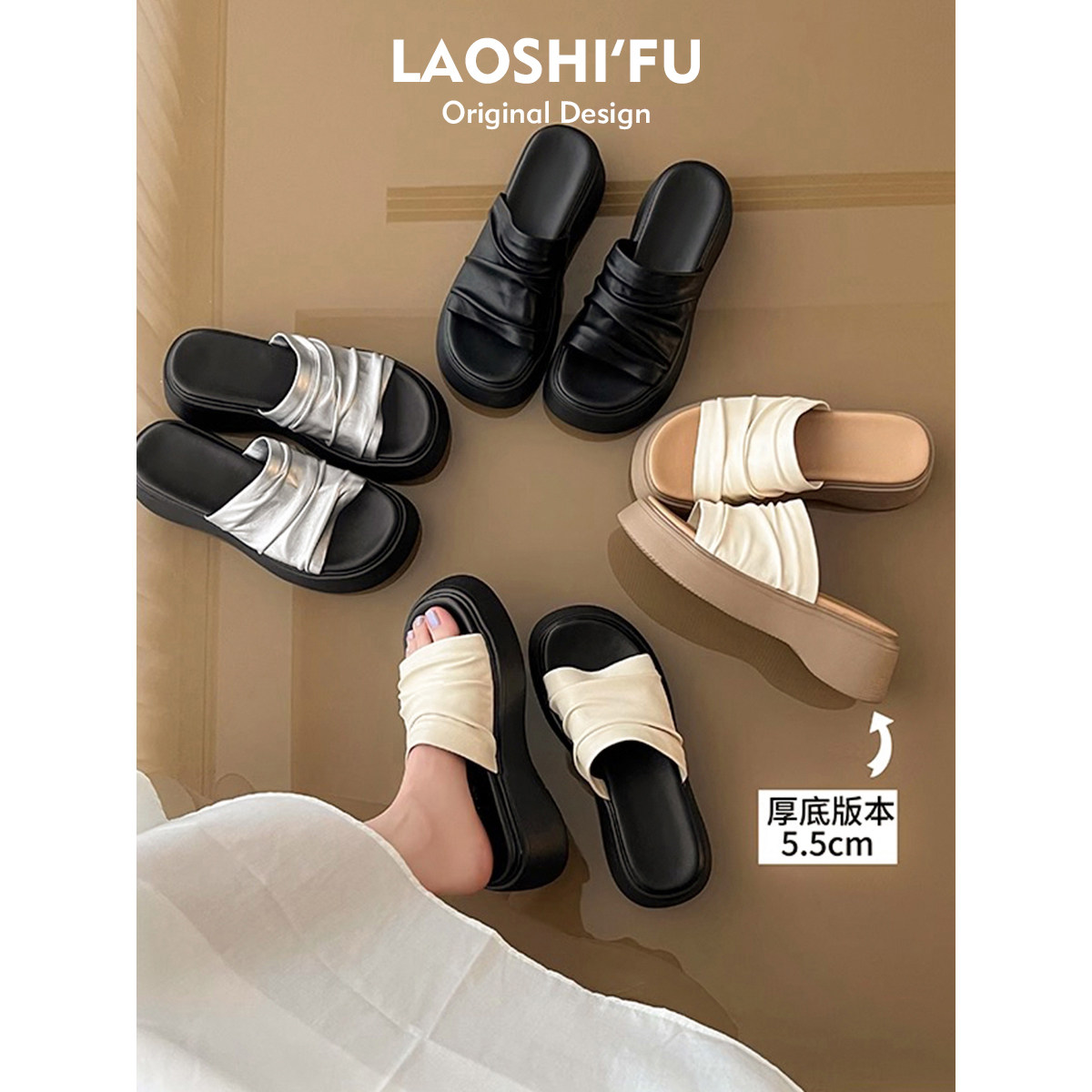 羊皮版!厚底增高褶皱拖鞋女2025新款夏外穿百搭平底一字带凉拖鞋