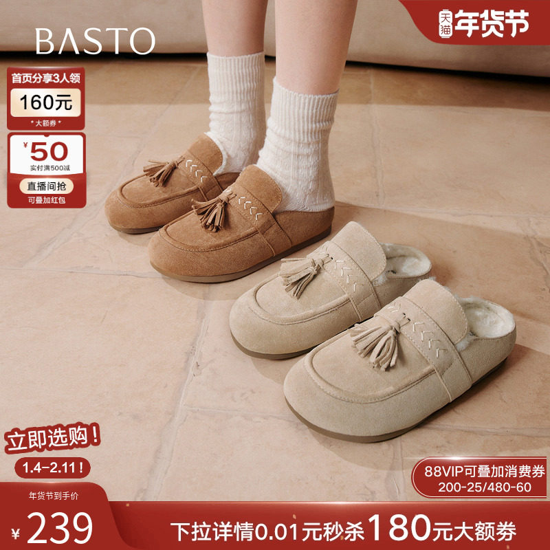 百思图2025冬季新款流苏勃肯鞋时尚休闲加绒保暖女拖鞋A7756DH5