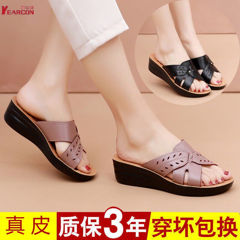 意尔康妈妈夏季新款外穿真皮拖鞋中老年防滑坡跟凉拖平底女士拖鞋