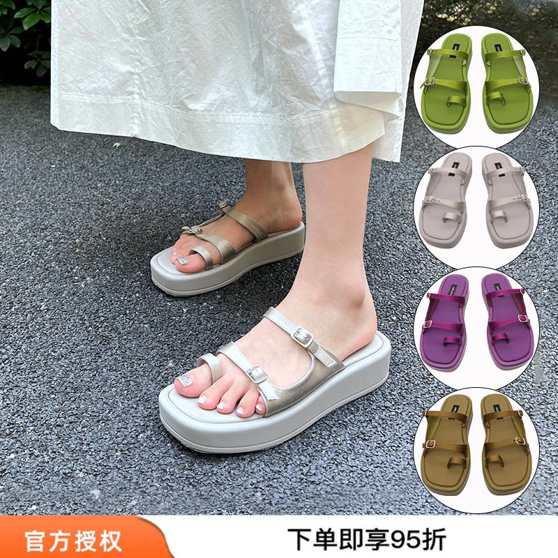 millies妙丽 露趾厚底增高一字型拖鞋皮扣女鞋设计感凉鞋夏季