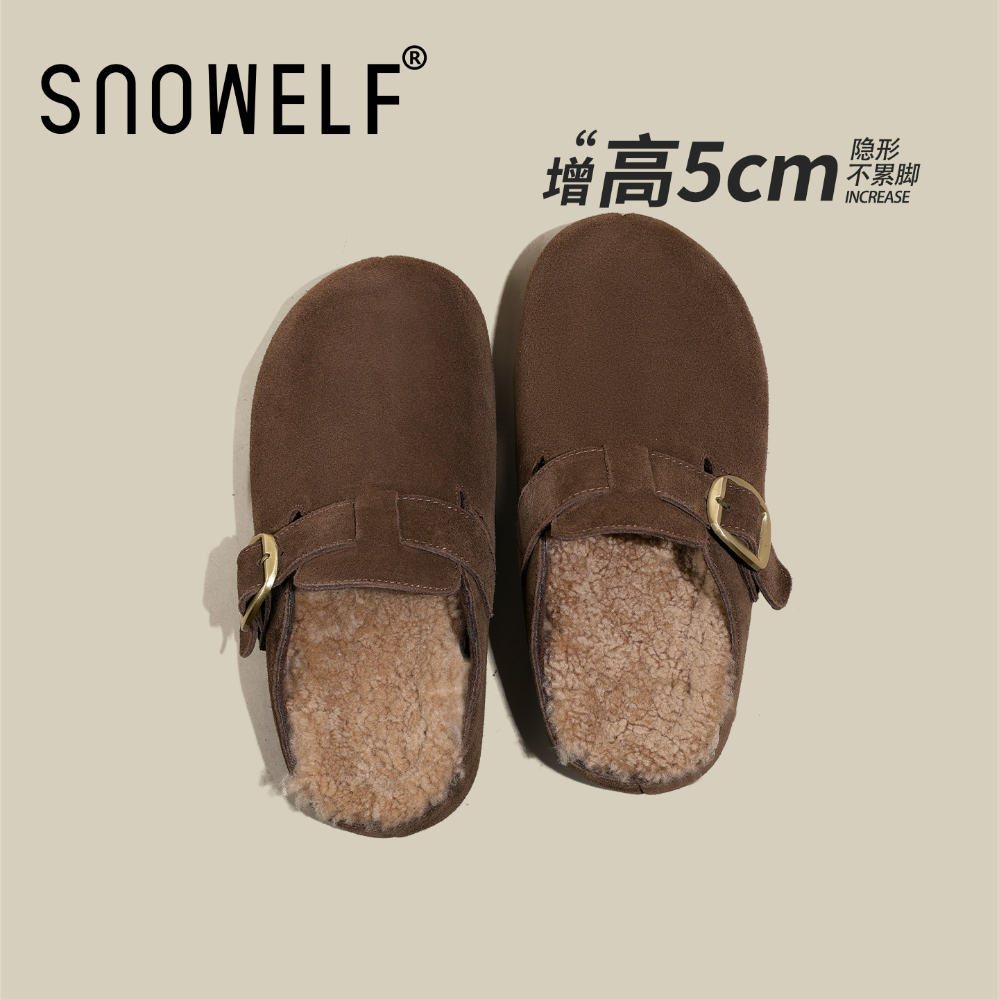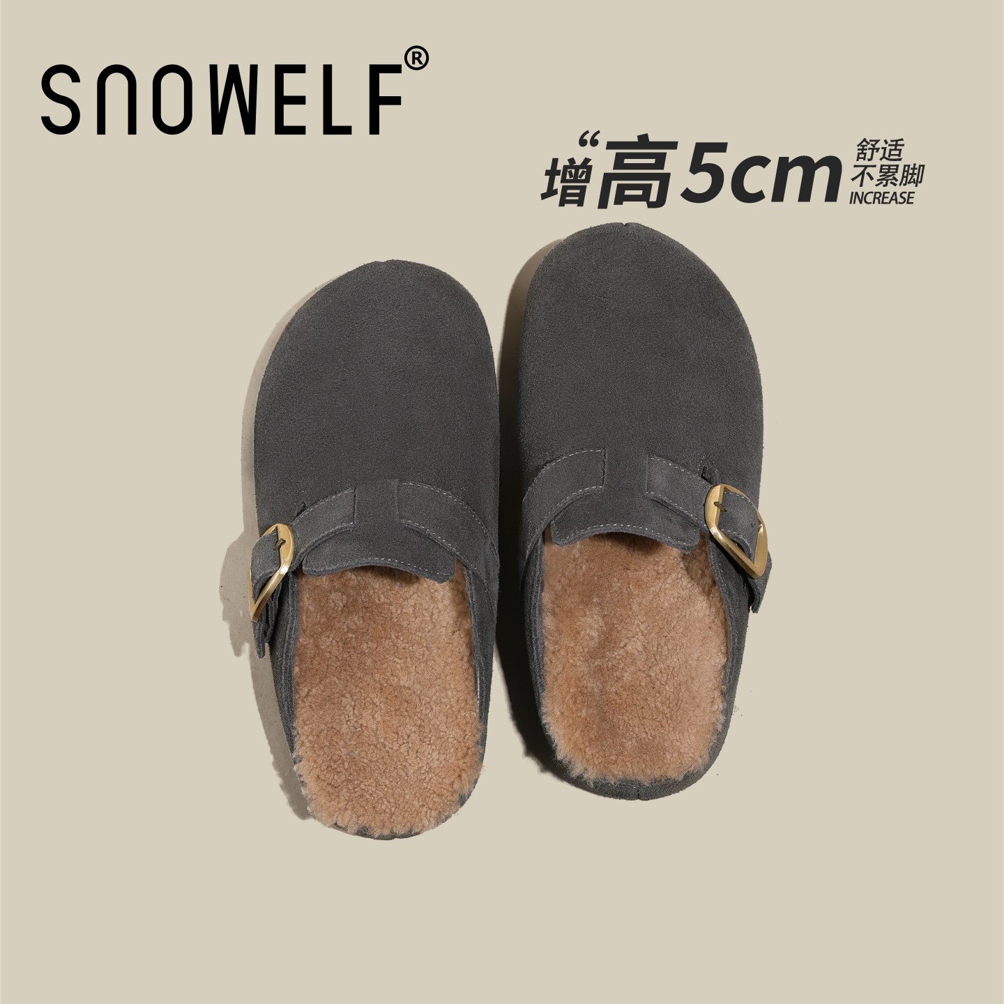 羊皮版!复古勃肯鞋内增高厚底毛绒包头半拖鞋休闲保暖羊羔毛毛鞋