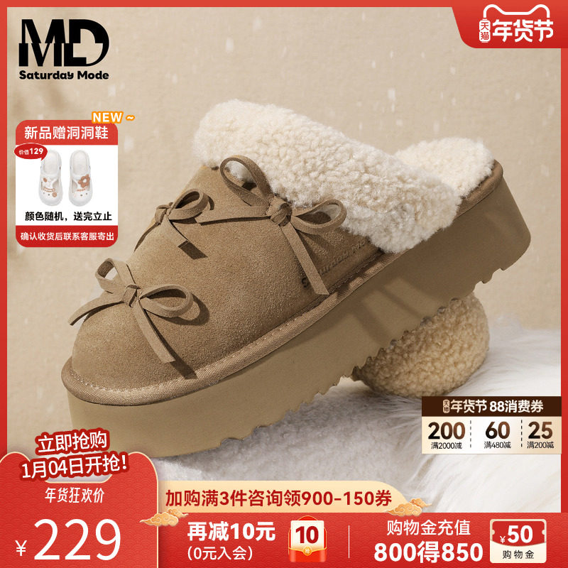 saturdaymode毛绒包头拖鞋女2025冬季新款保暖蝴蝶结懒人鞋半包拖