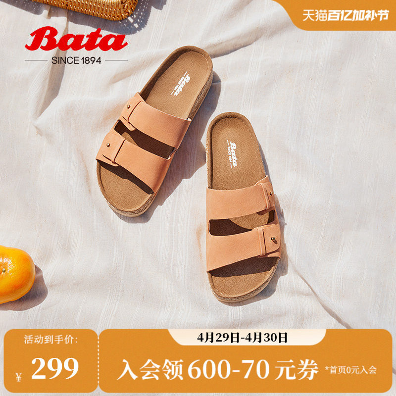 Bata木作勃肯鞋夏季新款英伦风牛皮厚底外穿女拖鞋AYR17BT4