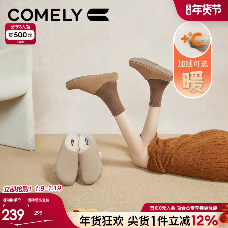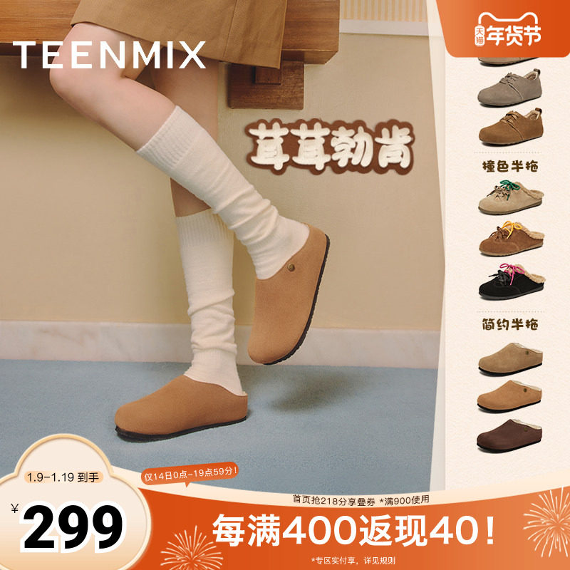 天美意茸茸勃肯鞋复古厚底加绒毛毛鞋女外穿包头棉拖鞋冬新款