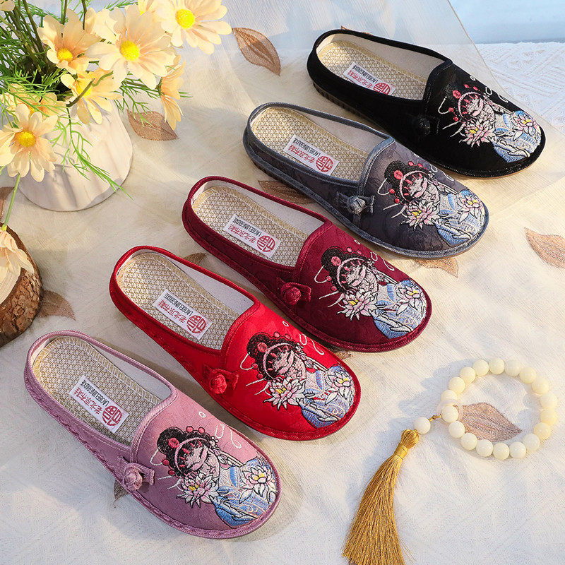 老北京布鞋包头拖鞋绣花鞋外穿软底民族风透气时尚脸谱绣花鞋新款