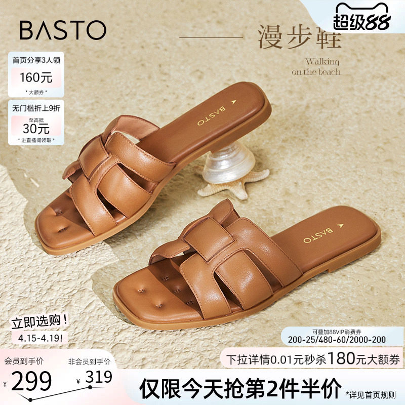 【漫步鞋】百思图夏商场新款平底外穿拖鞋女羊皮凉鞋TY409BT4