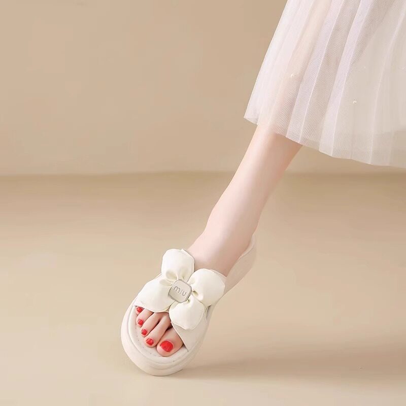 【苏茵茵】甜梦少女拖~4.5cm内增高方头坡跟羊皮蝴蝶结拖鞋女凉拖