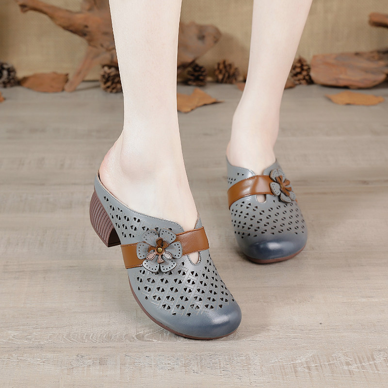 粗跟镂空女拖鞋2025夏季复古凉鞋包头女鞋拖牛皮民族风透气妈妈鞋
