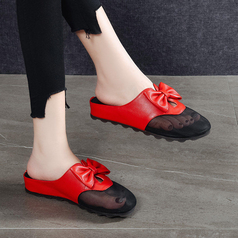 真皮网纱拖鞋女夏季外穿2026新款蝴蝶结平底凉拖软底防滑包头半拖