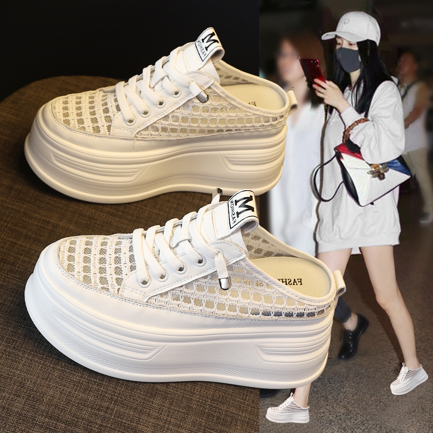 包头内增高半拖鞋女2026夏季新款百搭透气网面薄款厚底懒人小白鞋