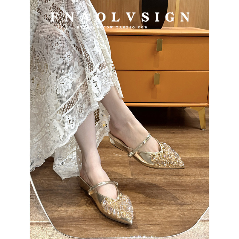 羊皮版~法式风水钻包头拖鞋女2026夏新款一字带内增高绝美半拖鞋