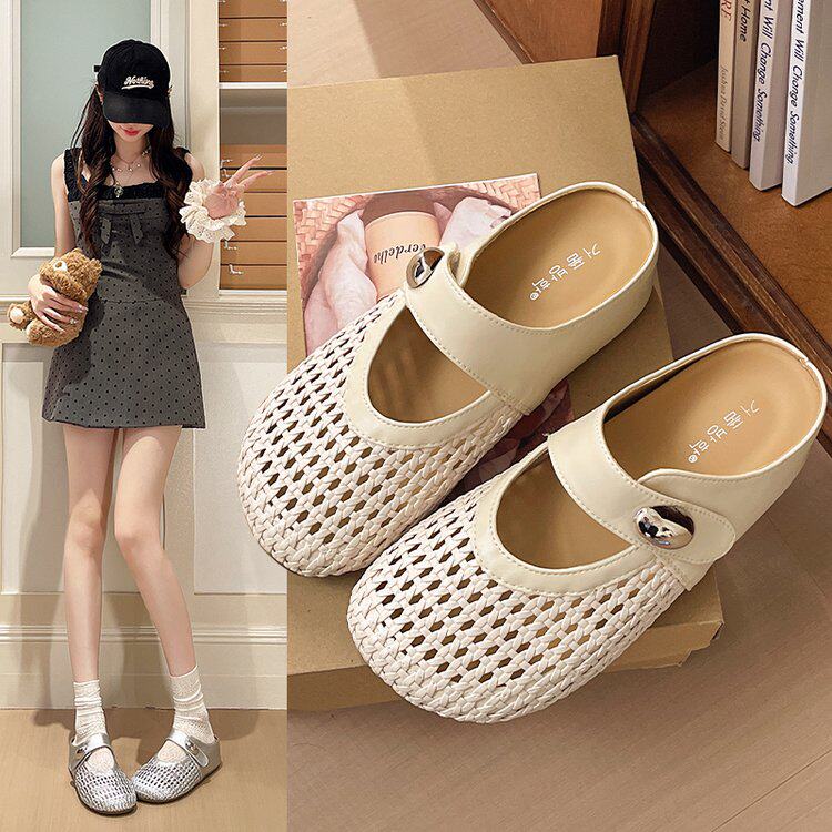 复古编织包头半拖鞋女2026新款魔术贴透气镂空编织轻便罗马凉拖鞋