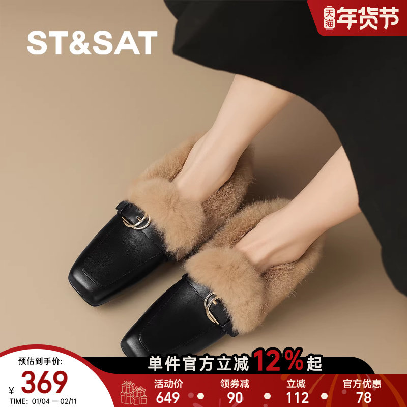 星期六冬季新款毛毛拖鞋保暖加绒高级感女平底单鞋豆豆鞋通勤百搭