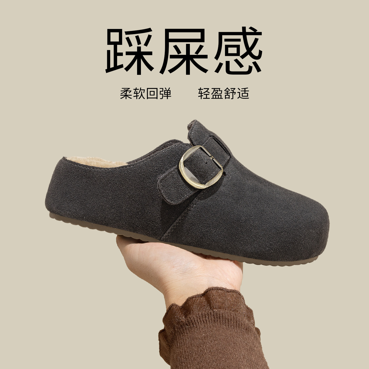 灰色厚底勃肯鞋女2025新款冬季加绒一脚蹬半拖鞋外穿保暖毛毛鞋子