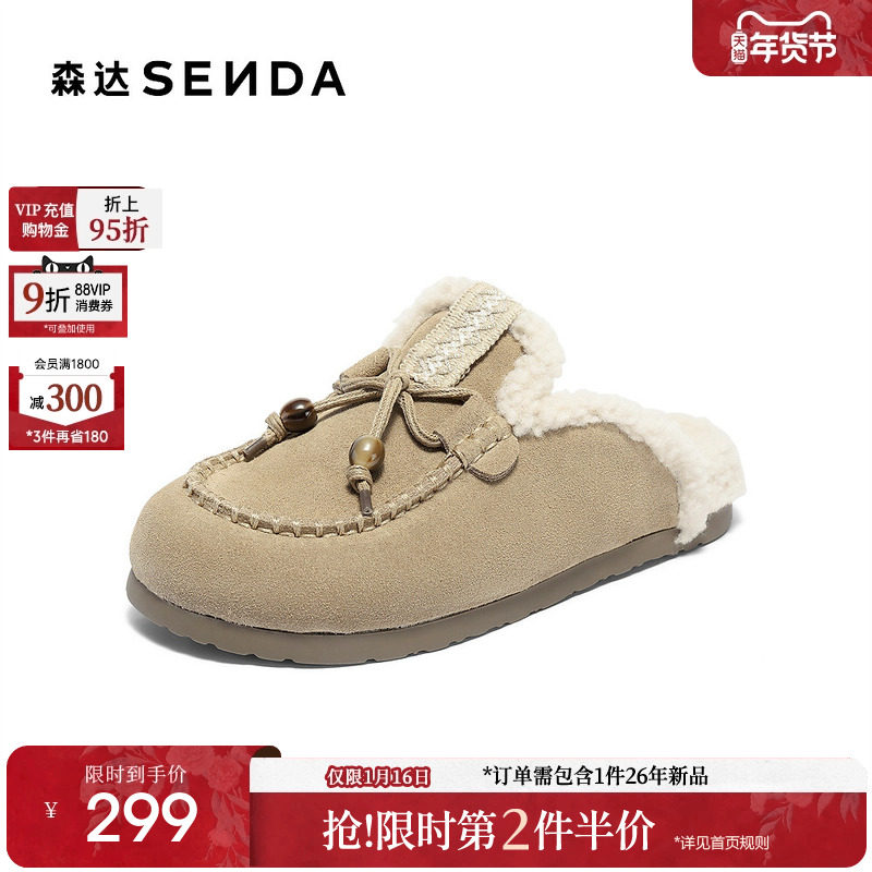 森达真皮毛毛鞋女2025冬新商场同款加绒加厚东北保暖拖鞋XST01DT5