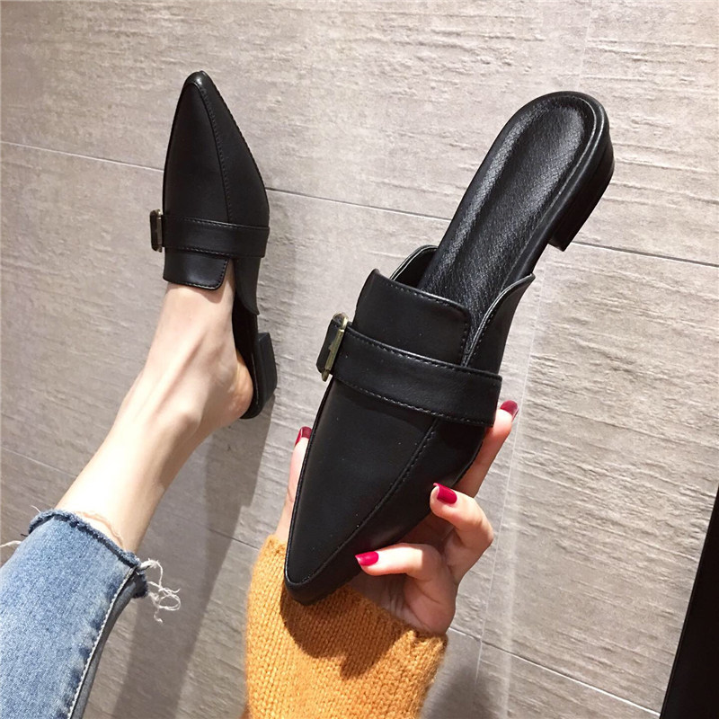 外贸原单女鞋真皮时尚新款圆头纯色皮带扣平底休闲包头穆特拖鞋
