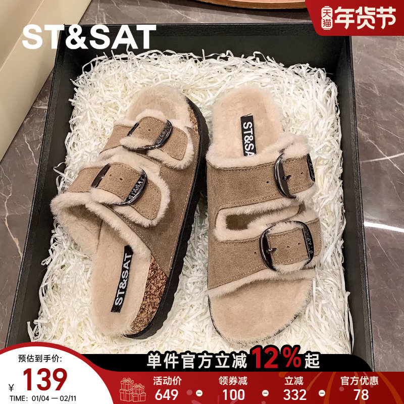 星期六毛毛拖鞋女外穿2025冬季新款厚底搭扣加绒勃肯棉拖加厚棉鞋