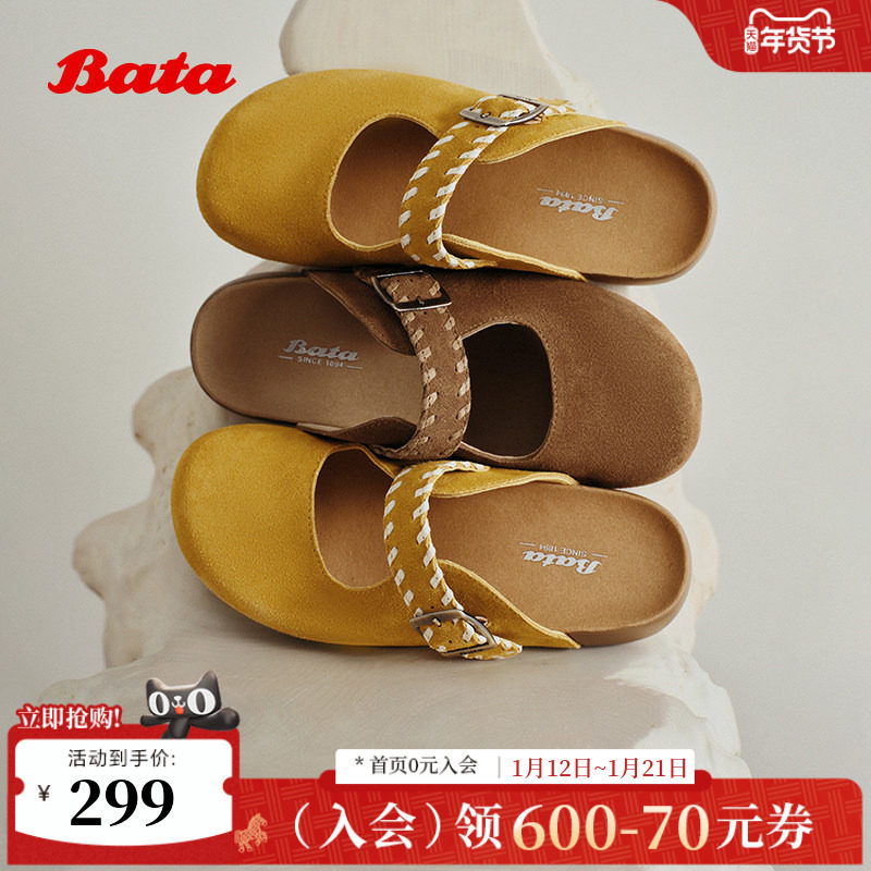Bata编织勃肯鞋女2025秋商场新款英伦风牛剖皮厚底凉拖鞋3094DCH5