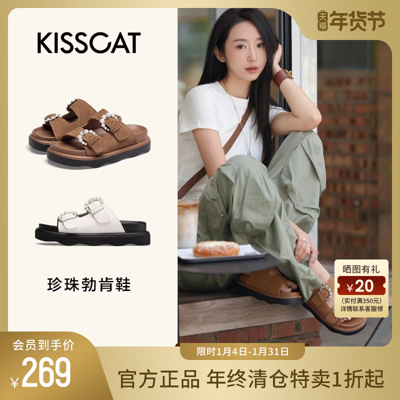 KISSCAT接吻猫秋季新款度假风懒人凉拖外穿厚底珍珠勃肯拖鞋