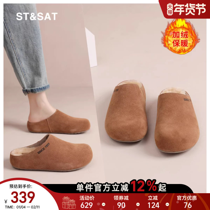 星期六包头勃肯鞋女款冬季真皮加绒保暖居家半拖鞋小个子厚底棉鞋