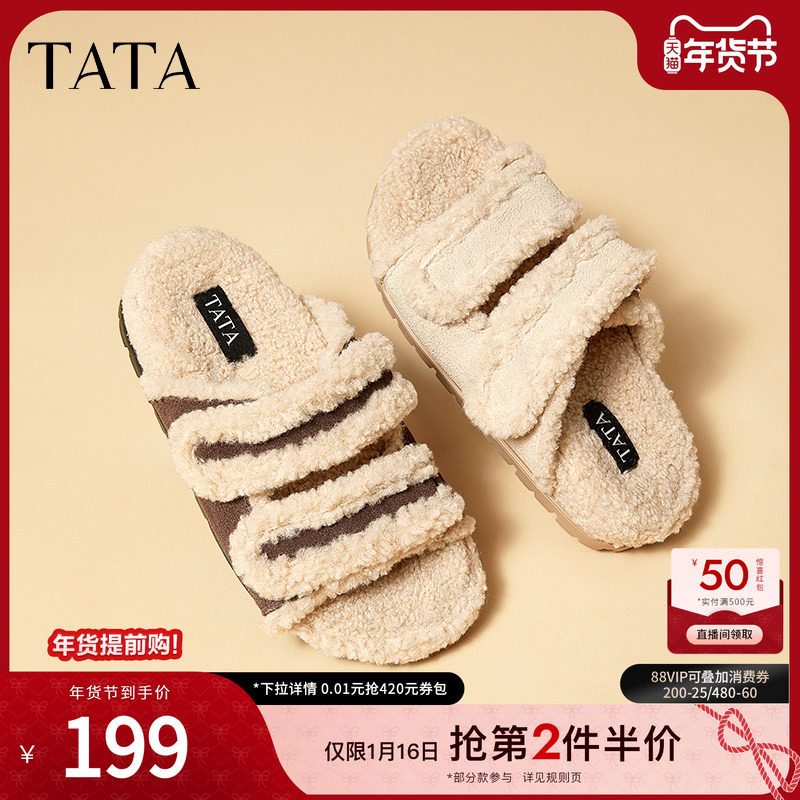 TATA他她复古加绒勃肯鞋女鞋休闲毛毛鞋保暖拖鞋春季新款CY401AT5