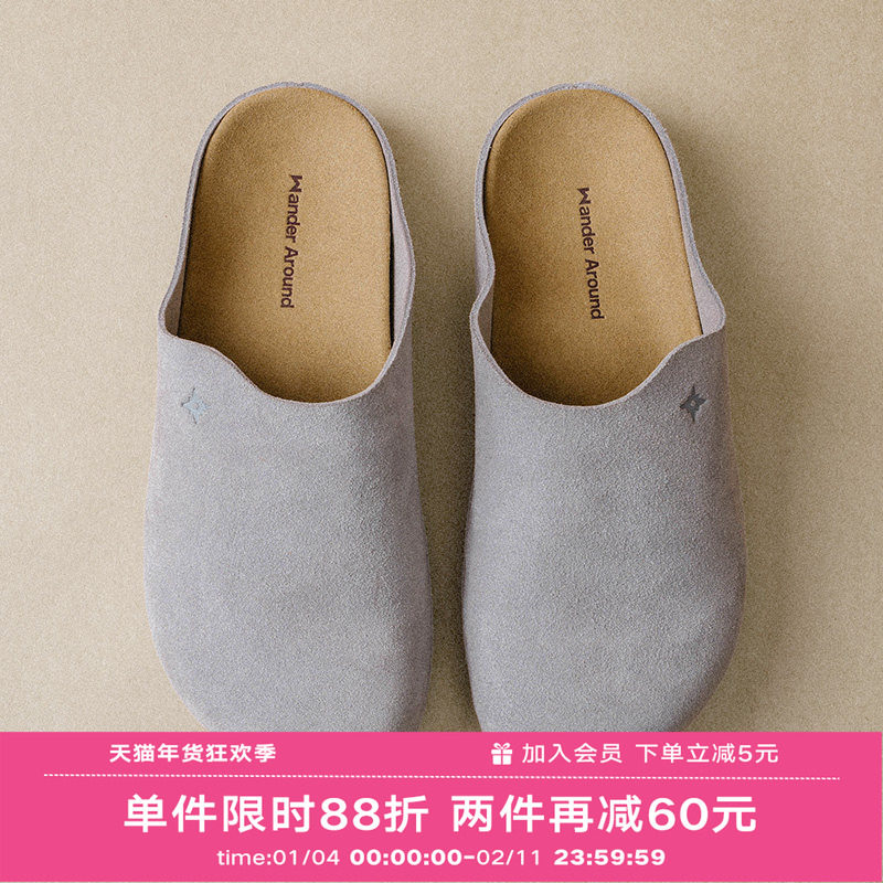 Wander around厚底增高牛皮绒面革软底勃肯鞋复古休闲懒人拖鞋女