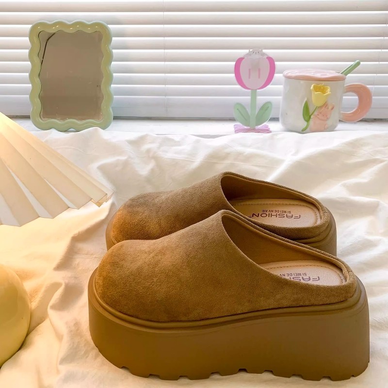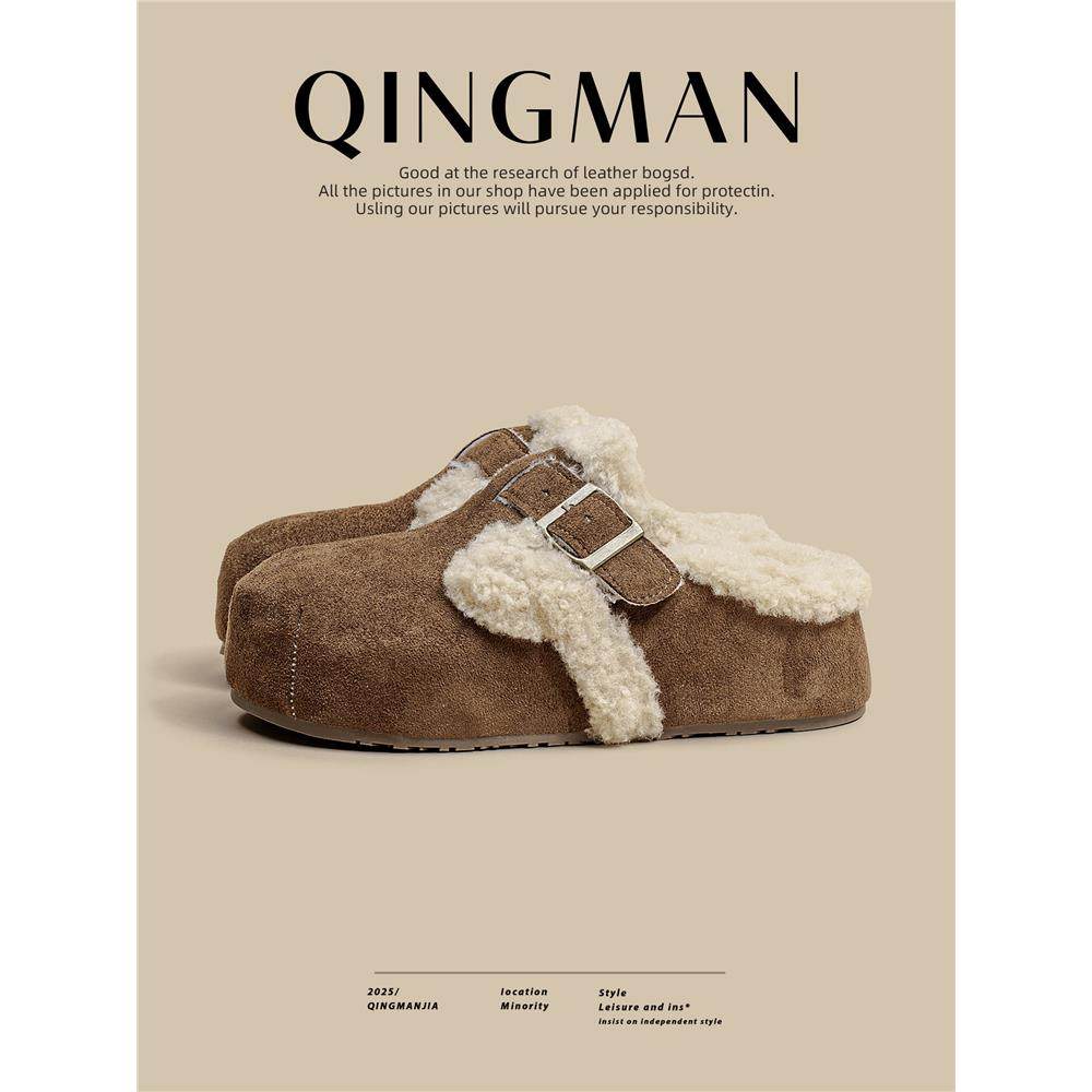 【苏茵茵】羊毛版本~马皮加绒保暖厚底毛毛勃肯拖鞋女包头半拖