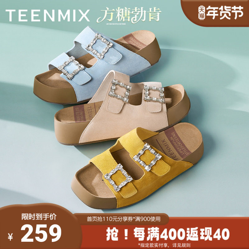 天美意2025夏新款厚底拖鞋外穿沙滩鞋凉鞋水钻女勃肯鞋KK049BT5
