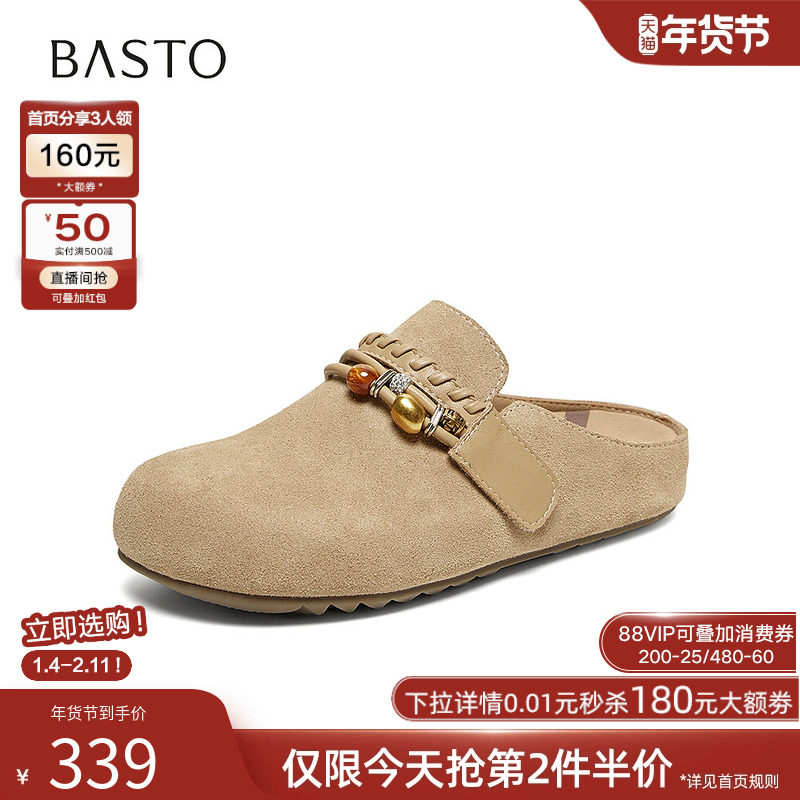 百思图2026夏季新款真皮厚底外穿勃肯鞋休闲女包头半拖鞋W1053BH6