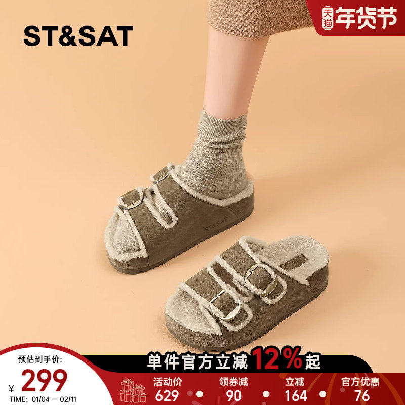 星期六厚底勃肯拖鞋女外穿2025年新款冬季加绒一脚蹬毛茸茸棉拖鞋