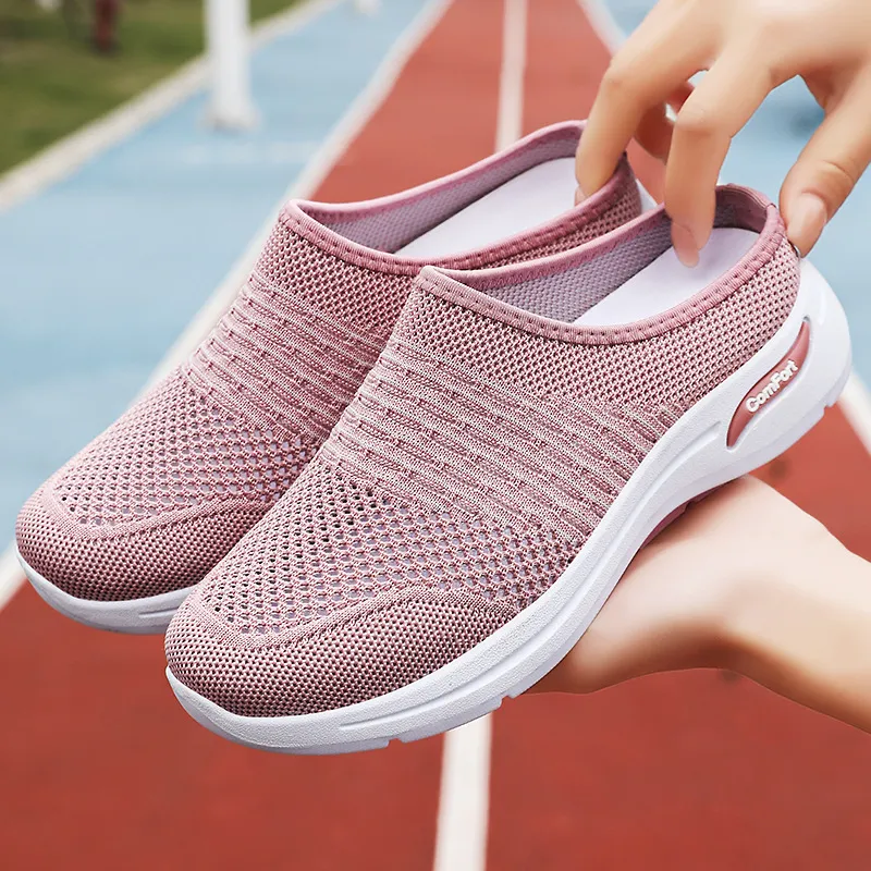女鞋休闲鞋夏季浅口半拖鞋网面透气飞织鞋软底妈妈鞋一脚蹬懒人鞋