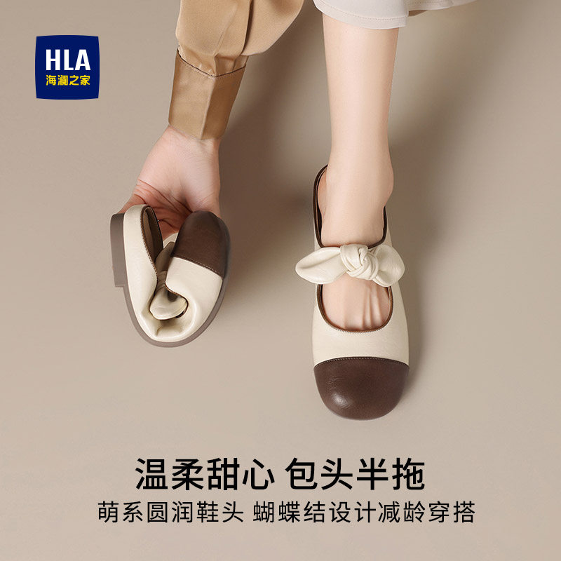 HLA/海澜之家女鞋2025新款法式蝴蝶结包头半拖鞋女舒适玛丽珍单鞋
