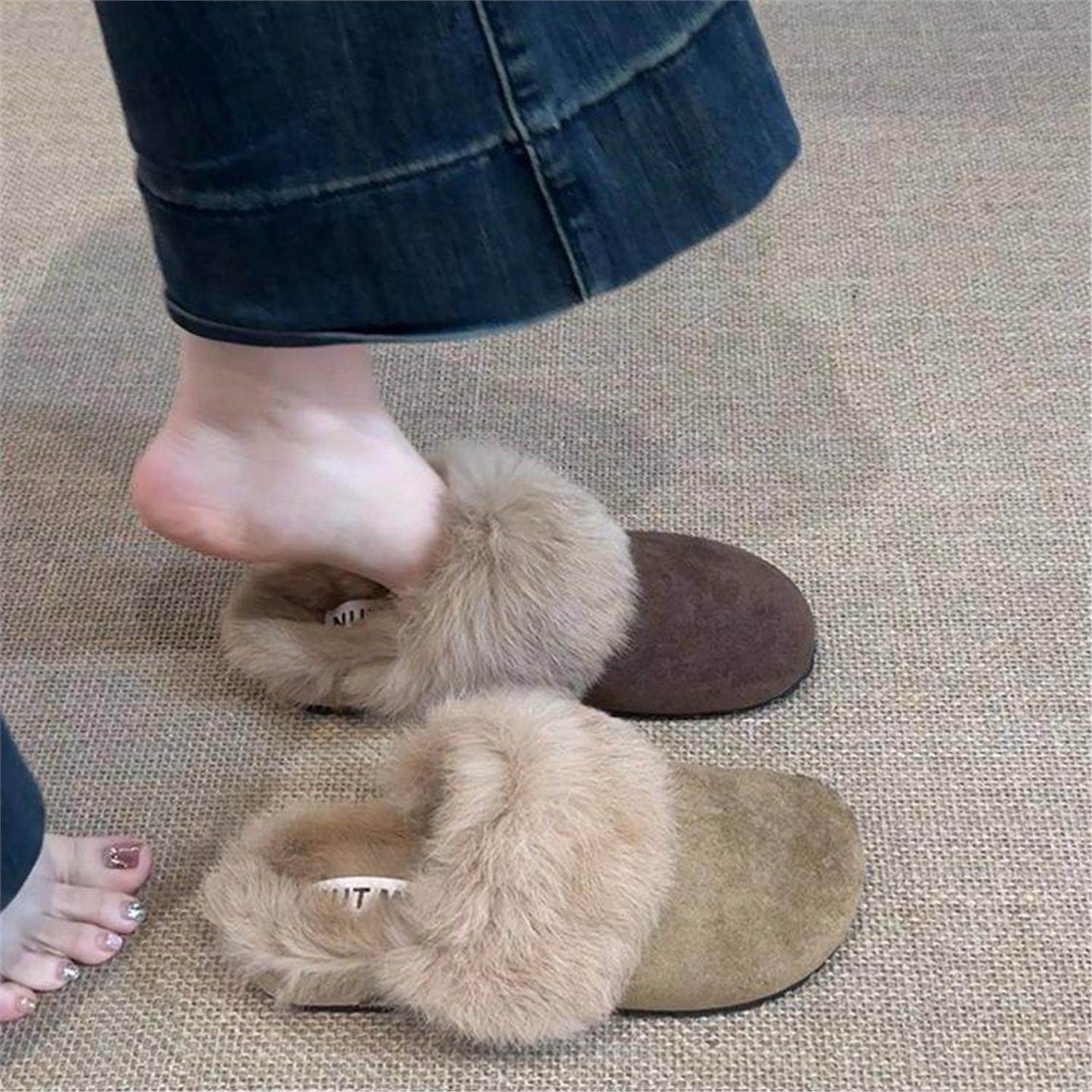 HAIMKC大码女鞋41一43拖鞋女卡其色2025秋冬季毛绒外穿时尚毛毛鞋