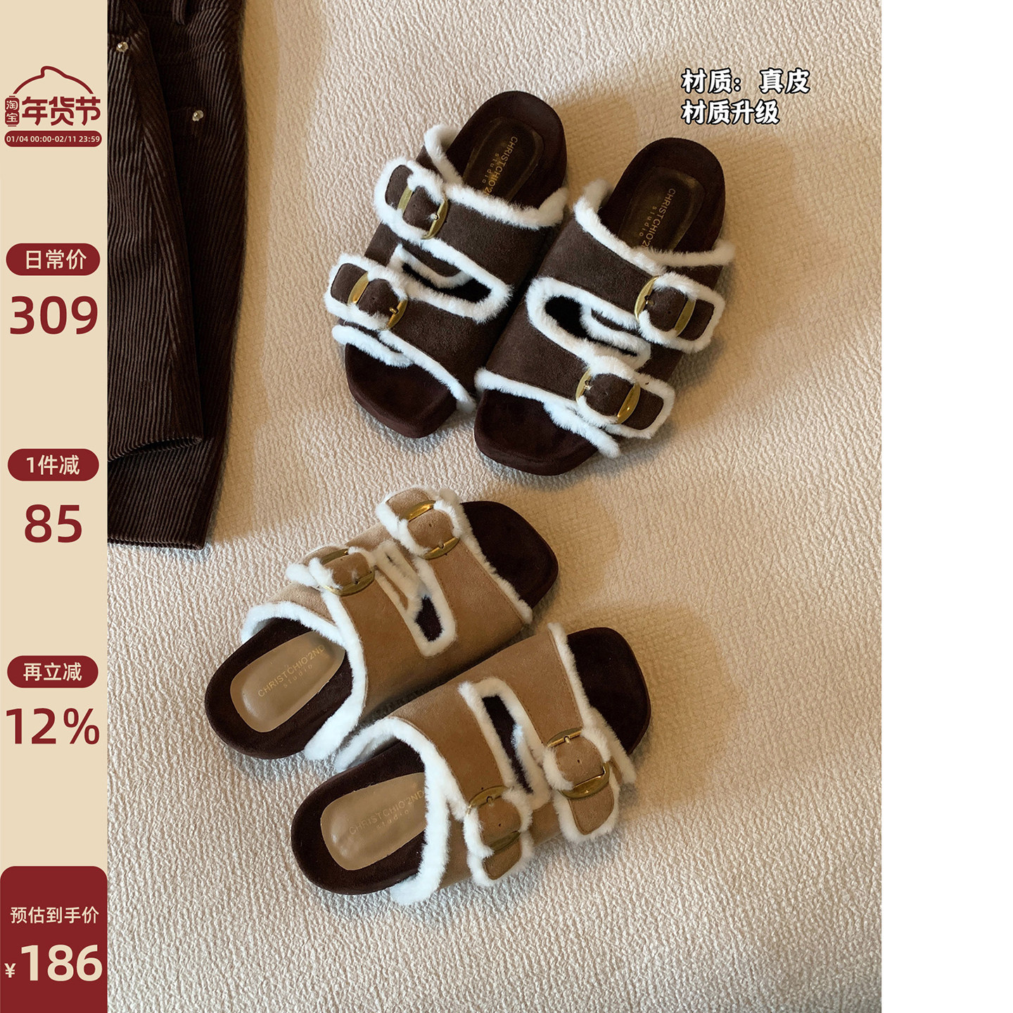 千百度勃肯鞋休闲加绒拖鞋暖茸茸毛毛拖鞋家居家用加绒舒适平底