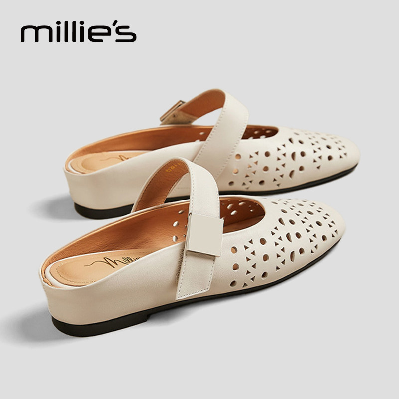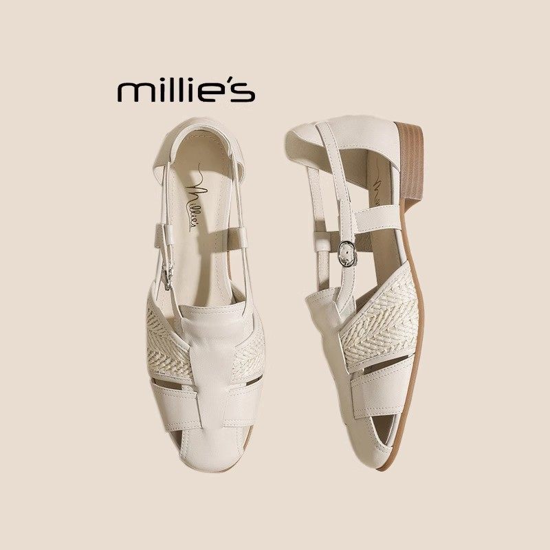 MILLIE'S/妙丽圆头平底复古风编织镂空设计感时尚百搭包头拖鞋女