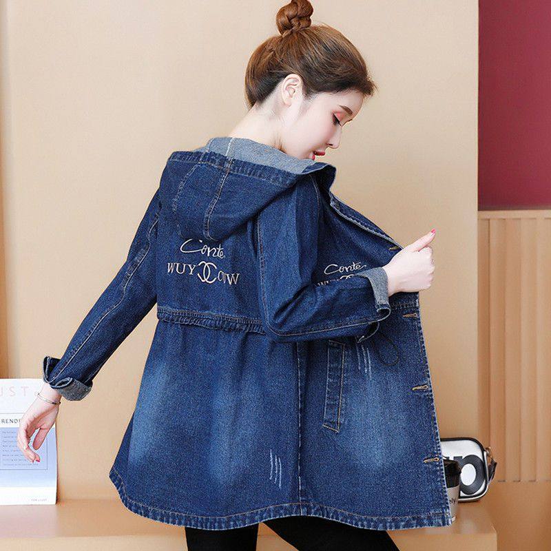 牛仔风衣女新款连帽学生外套秋冬中长款收腰显瘦宽松刺绣上衣