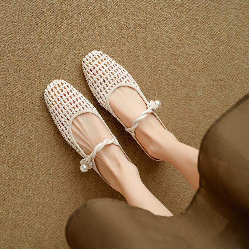 意大利Raraente~ !编织镂空珍珠包头凉拖鞋女百搭粗跟透气仙女风