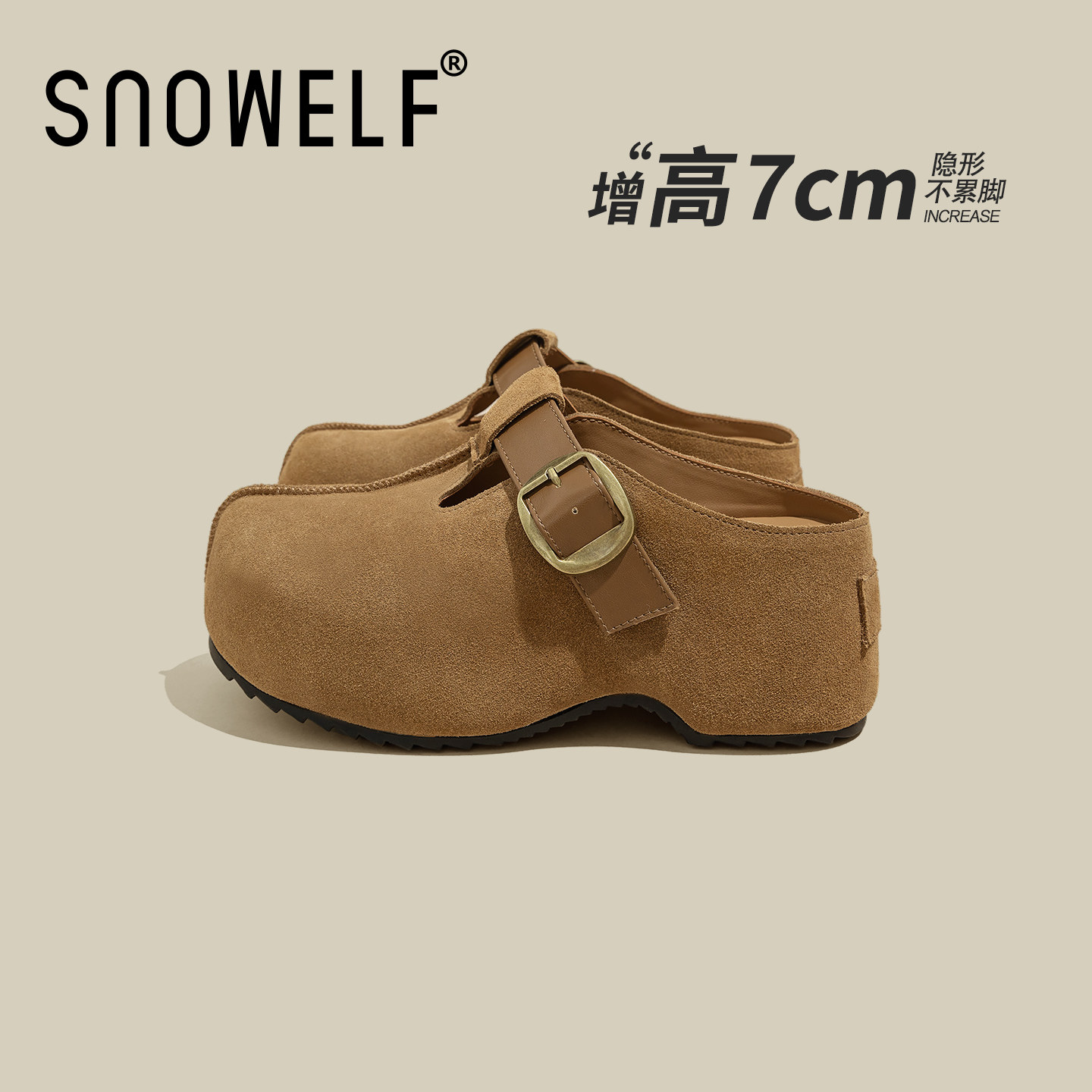 Wander around厚底增高牛皮绒面革软底勃肯鞋复古休闲懒人拖鞋女