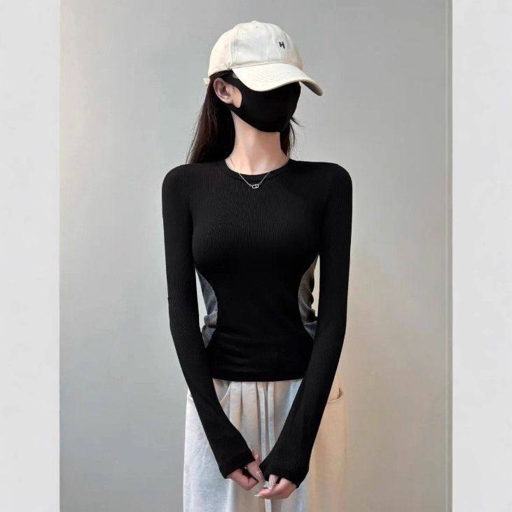 秋冬掐腰显瘦小圆领上衣小众气质打底衫潮新款拼接设计长袖T恤女
