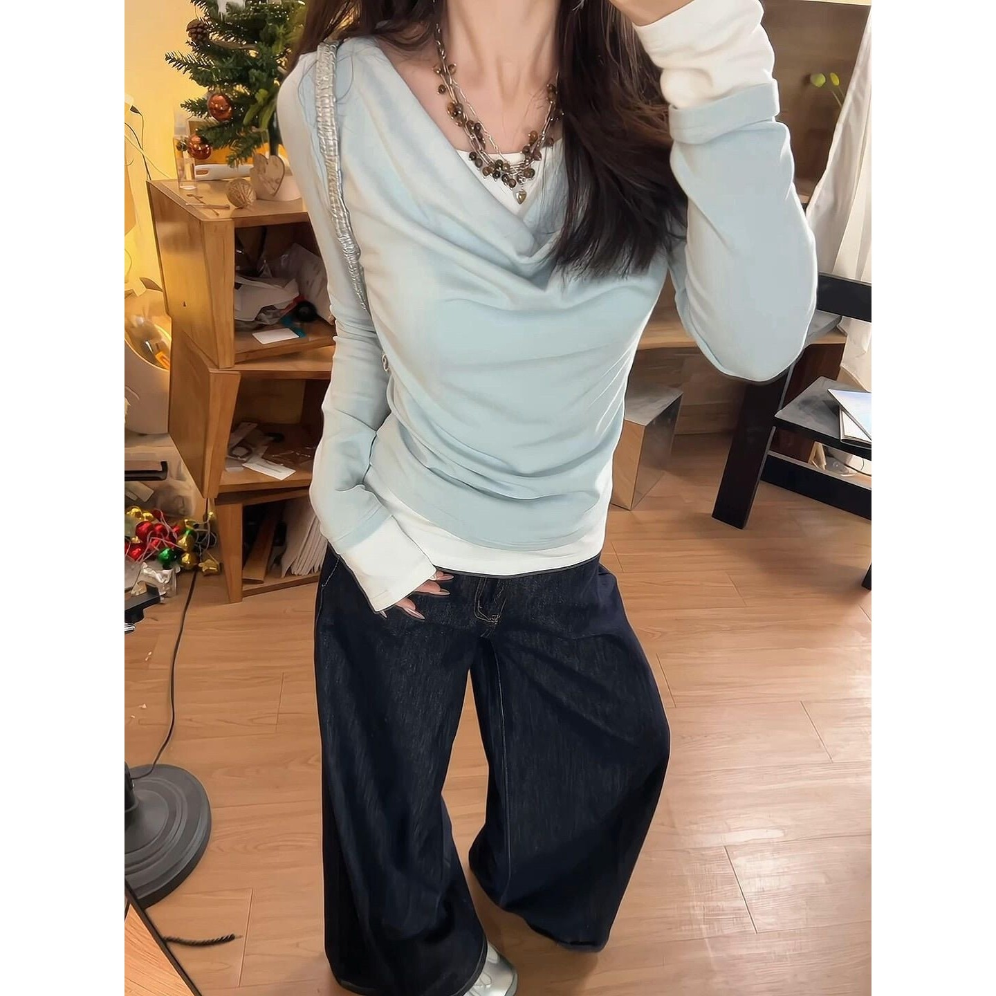 新款荡领拼接羊毛假两件长袖打底衫女2025内搭修身纯棉T恤上衣