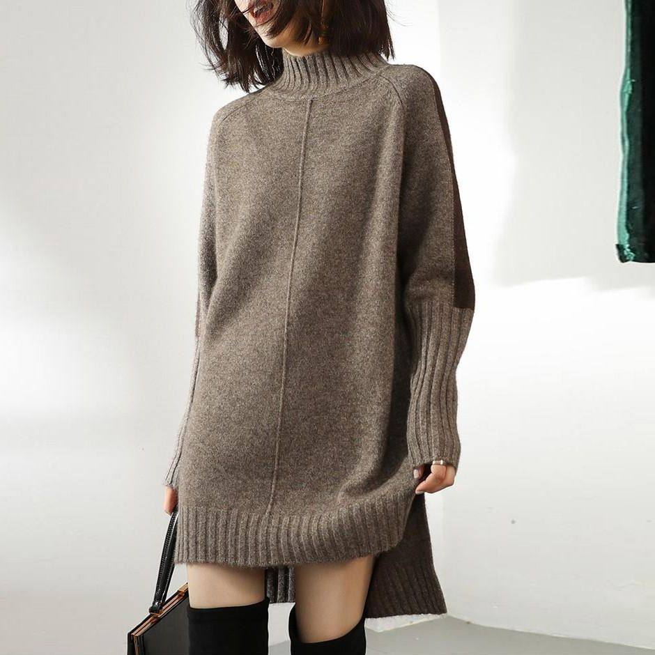 中长款毛衣女半高领包臀连衣裙宽松加厚秋冬新款拼色针织打底衫女