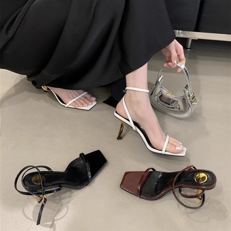 2025年夏季新款一字扣方头细跟中跟鞋女外穿细带凉拖鞋高跟凉鞋