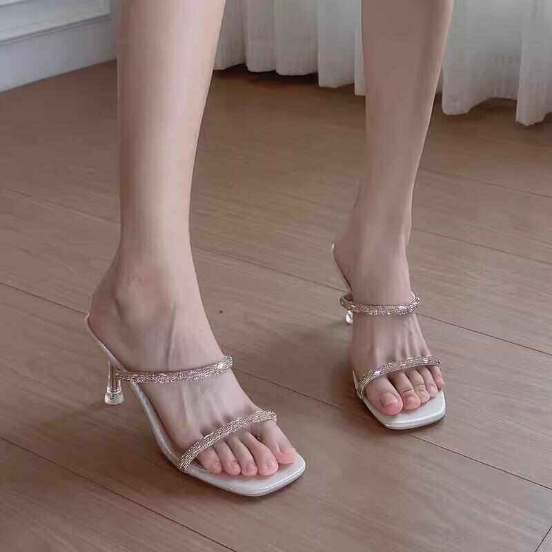 高跟凉鞋女水钻一字带2025夏季新款气质绝美露趾外穿细跟透明拖鞋