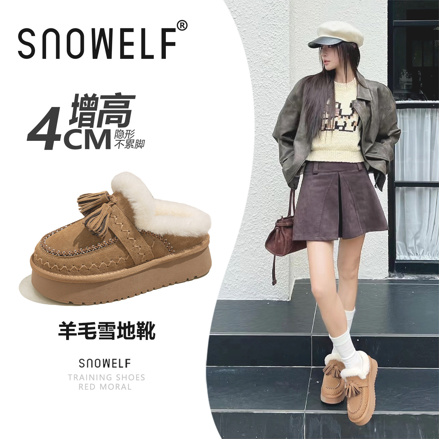 美拉德风!厚底真牛皮纯羊毛增高雪地靴保暖女式拖鞋2025冬季新款