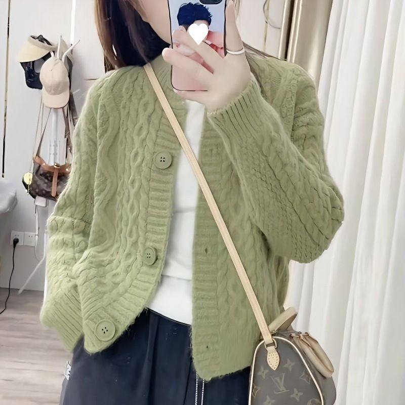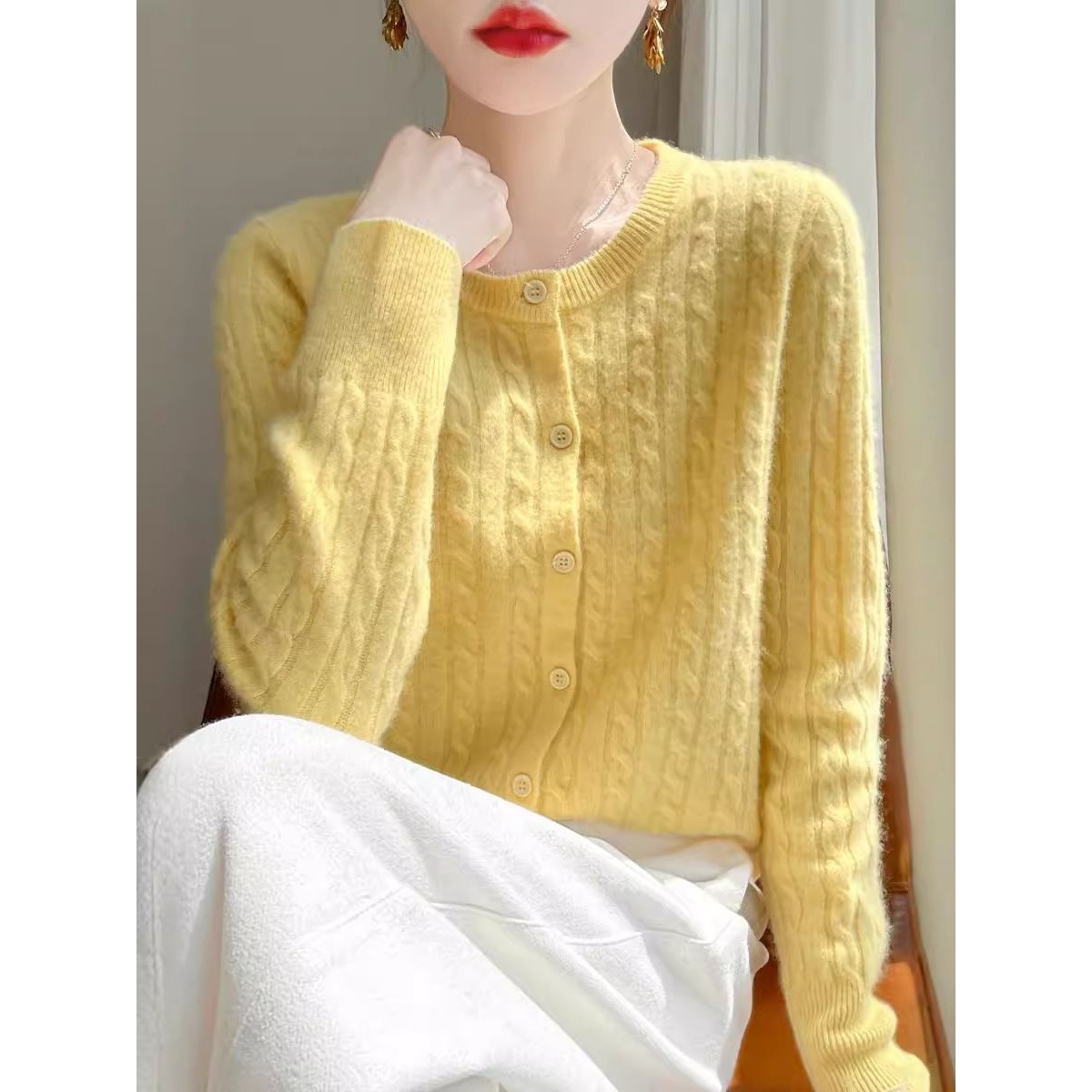 24经典圆领针织衫老钱风女麻花开衫外套纯色绞花洋气长袖毛衣外搭