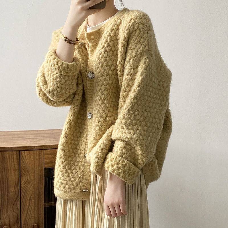 黄色毛衣女秋冬2025新款宽松日系慵懒风开衫外套高质感针织上衣厚